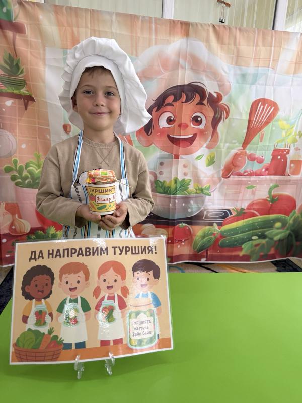 Доката работеха малчуганите обсъждаха цветовете, формите и вкусовете на зеленчуците, пяха весели песнички и споделяха кои са им любимите. Накрая всеки получи бурканче с етикет "Туршия на.....", украсено с рисунка и усмивка.